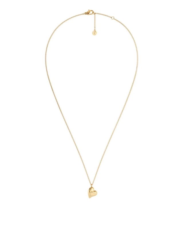 En lekfull och mjuk hjärtform bjuder serien Amorina på. Här i ett vackert halsband i 14K guldplätering med en kedja som skrider genom hjärtcharmens fäste. Härligt lättstylat, och passande som kärleksfull gåva till någon du tycker om. Matchar fint med seriens örhängen.