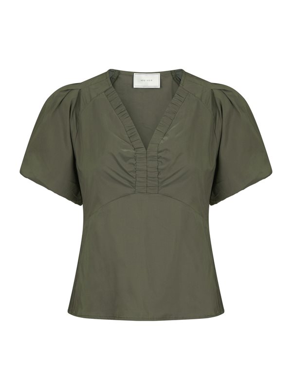 Stilren blus från Neo Noir i mjuk bomullsmix poplin. Modellen har en feminin V-ringning med diskret rynkning framtill och voluminösa ärmar som slutar strax ovanför armbågen med resår för en modern siluett. Dold dragkedja i sidan ger en smidig och stilren avslutning.