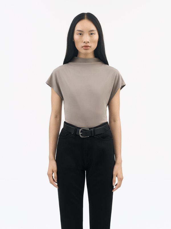 Alitta är en minimalistisk jerseytopp i en förhöjd basmodell med en figurnära passform. Toppen har en skulptural trattringning och en bred axellinje som faller något över armen. Den torra, matta jerseyn faller vackert och är perfekt genomskinlig.