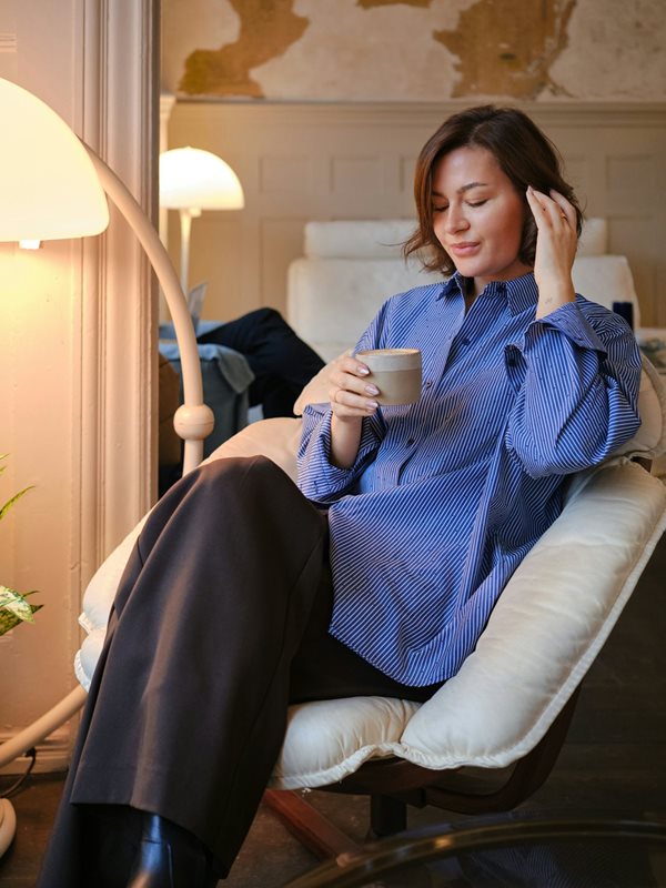 Cool oversized skjorta i en fin randig poplin-kvalitet med glittrande stenar. Modellen är 176 cm och bär storlek 36.
