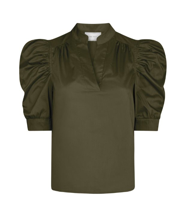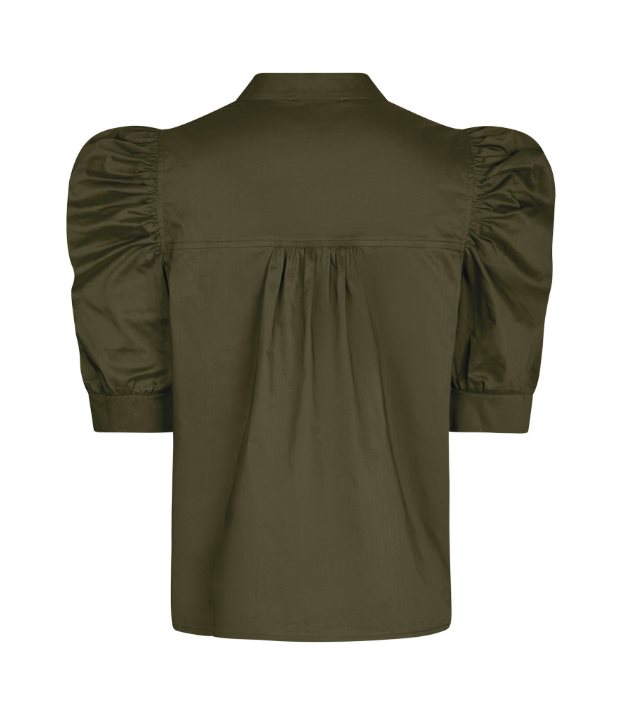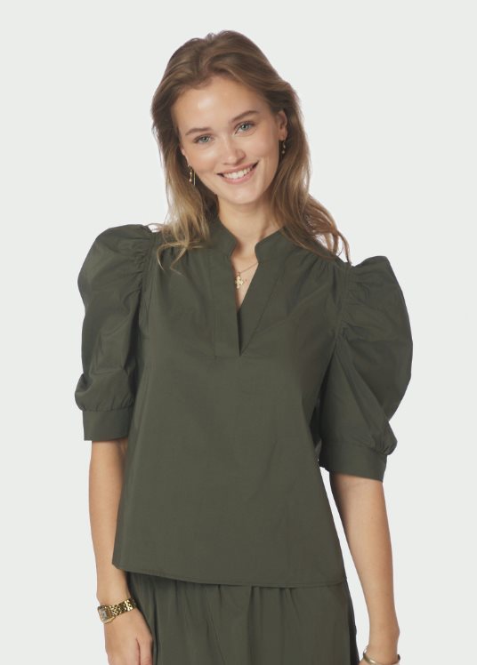 Feminin blus från Neo Noir i krispig bomullsmix poplin med dekorativ sömnad som ger ett elegant uttryck. Designad med V-ringning framtill samt markerade puffärmar som tillför både volym och karaktär. En modern blus som är lika fin till vardags som till mer uppklädda tillfällen.