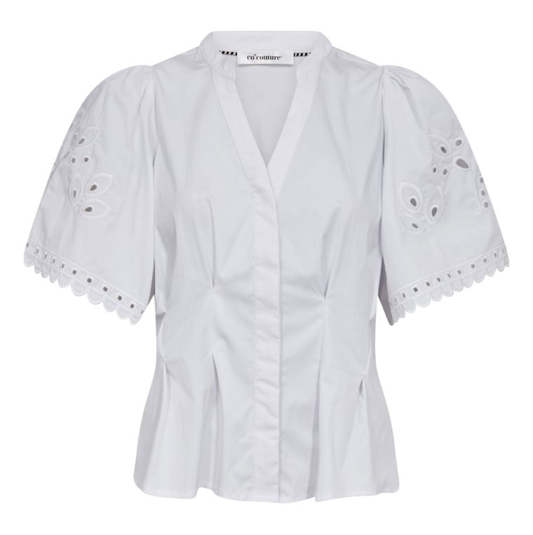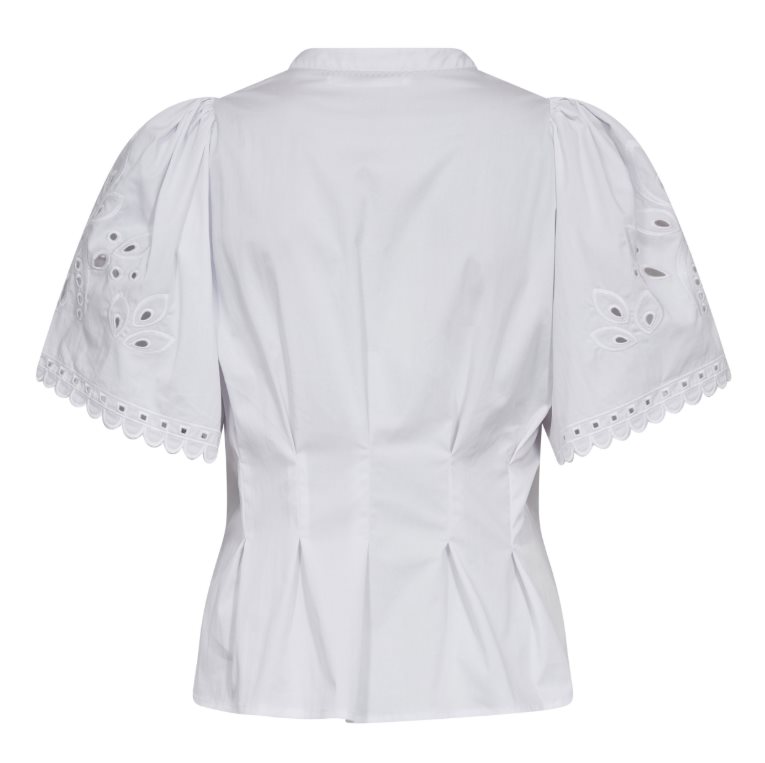 PoppyCC Emb SS V-Shirt är en feminin och somrig blus i klassiskt vitt med vackra broderade detaljer på ärmarna. Den figurnära passformen framhävs av insnitt i midjan och ger en smickrande silhuett, medan de korta ärmarna med dekorativ hålbrodyr och vågig kant skapar ett romantiskt uttryck. Den stilrena V-ringningen utan krage gör blusen enkel att bära både till jeans, kjol eller dressade byxor.