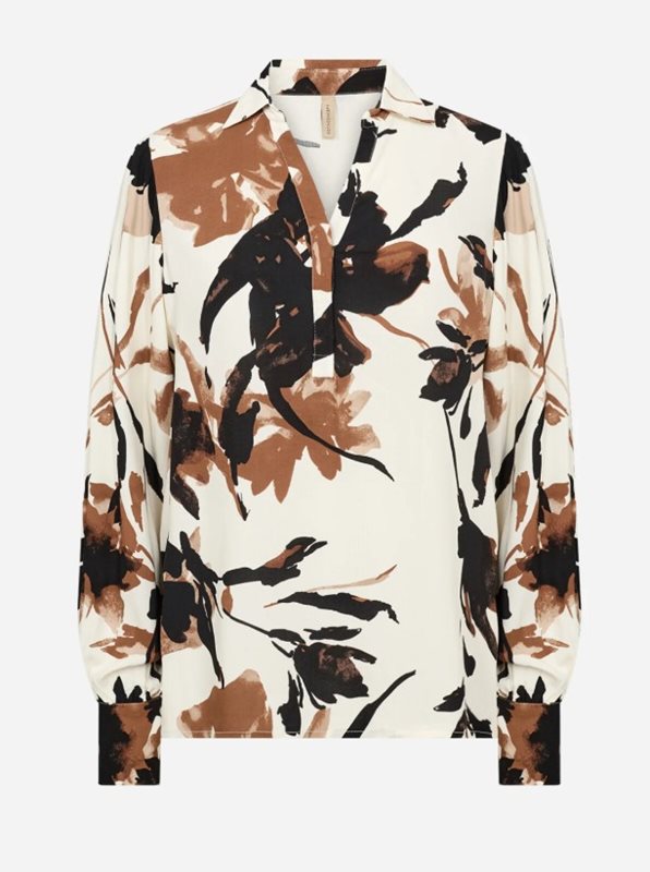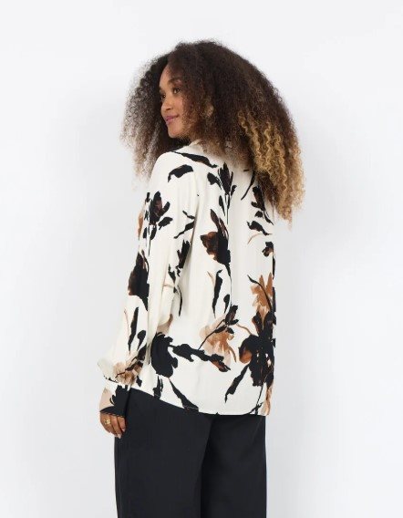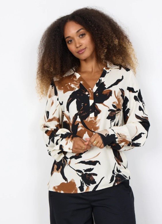 En elegant mönstrad blus från SoyaConcept, tillverkad i ett mjukt och luftigt viskostyg med vacker lyster. Den avslappnade passformen kombinerat med den stilfulla knappslån och de feminina ärmarna gör den perfekt både till vardag och fest.