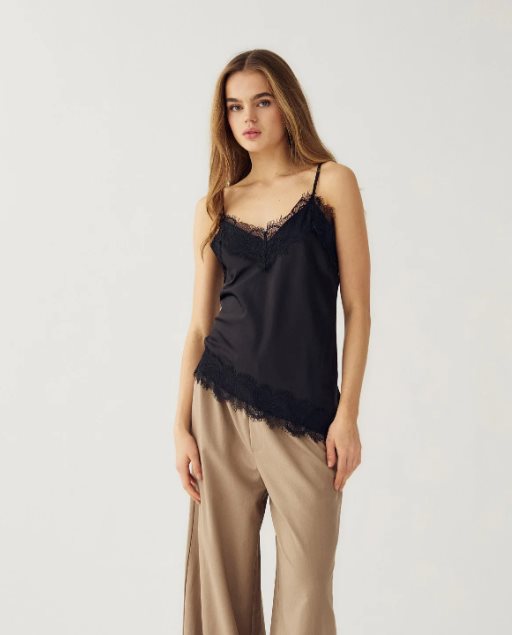 N-Minne Blouse från Noella är ett elegant spetslinne i mjuk satin med feminina spetsdetaljer som ger ett lyxigt och tidlöst uttryck. Den vackra spetsen framtill och nedtill kombineras med en asymmetrisk nederkant som skapar en modern silhuett. Tunna, justerbara axelband ger en perfekt passform och gör toppen enkel att styla.