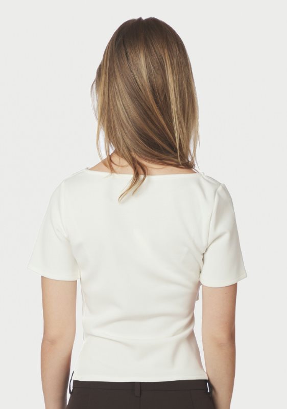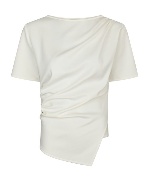 Fin asymmetrisk t-shirt i en mjuk kvalitet. T-shirten har drapering framtill. Modellen är 176 cm lång och bär storlek 36.