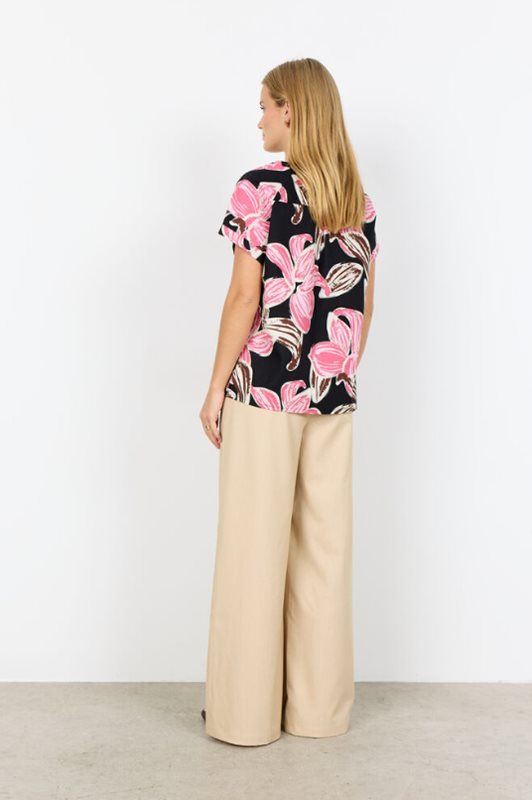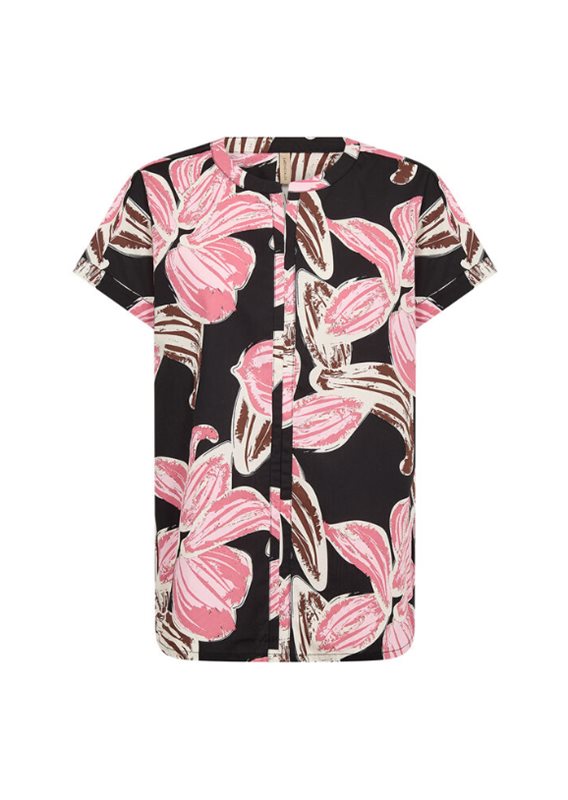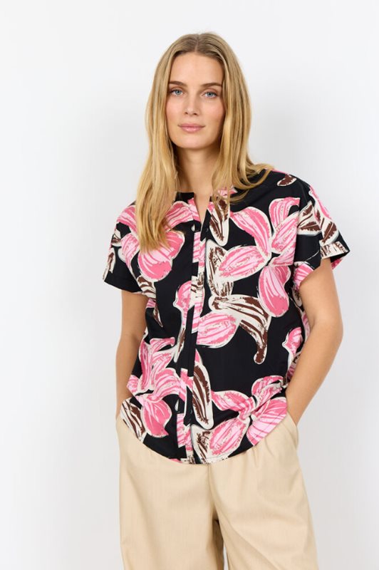 SC-CARALINA 1 Blus är tillverkad av 100% ekologisk bomull. Den har en rund halsringning, korta ärmar och ett djärvt blommönster. Denna eleganta blus passar bra tillsammans med skräddarsydda byxor eller en enkel kjol för avslappnade utflykter eller möten.