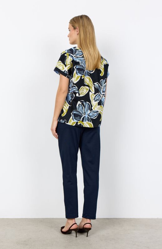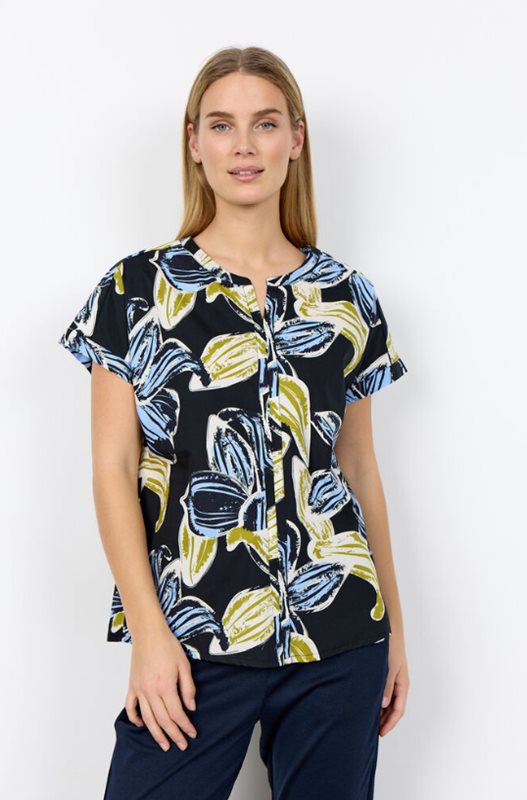 SC-CARALINA 1 Blus är tillverkad av 100% ekologisk bomull. Den har en rund halsringning, korta ärmar och ett djärvt blommönster. Denna eleganta blus passar bra tillsammans med skräddarsydda byxor eller en enkel kjol för avslappnade utflykter eller möten.
