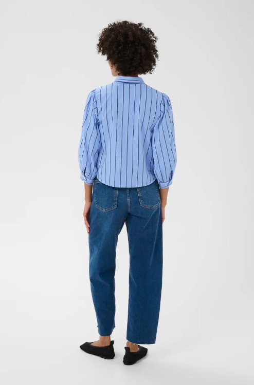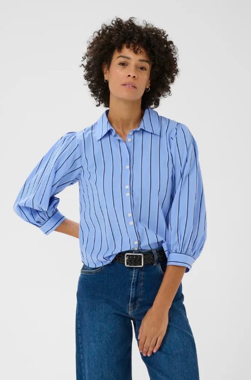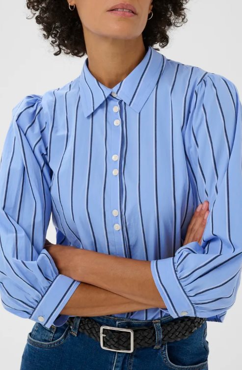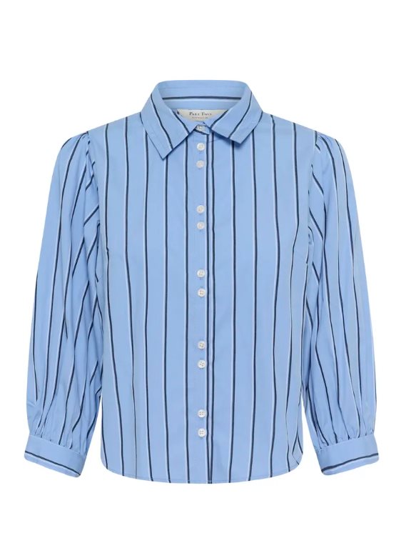 AnaisPW Shirt är en feminin och stilren skjorta från Part Two, designad i mjuk ekologisk bomull med klassiska ränder. Den blå basen tillsammans med smala, mörkare ränder ger ett tidlöst och fräscht uttryck som passar lika fint till jobbet som till en mer avslappnad vardagslook. Modellen har en rak passform med lätt puffade ärmar och breda manschetter som skapar en elegant silhuett.