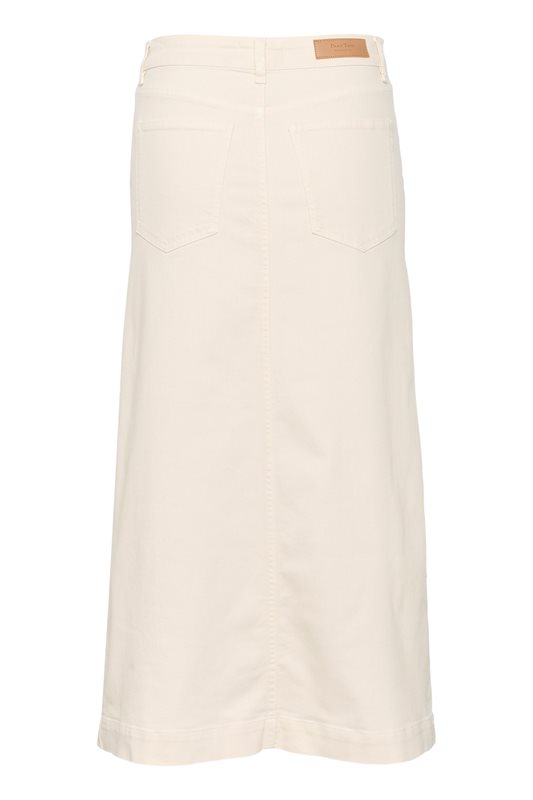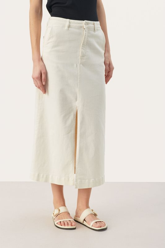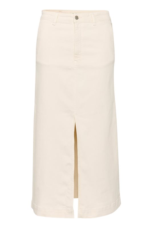 Denna kjol kombinerar den klassiska denimstilen med en modern touch av en framåtriktad slits, vilket lägger till en lekfull dimension till din outfit. Den vita färgen ger fräschhet och mångsidighet, perfekt att styla med både färgglada toppar eller enkla blusar. Med en bekväm passform är den idealisk för att framhäva din personliga stil med lätthet och elegans.