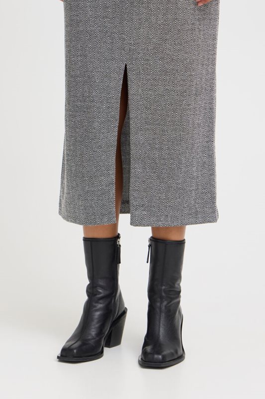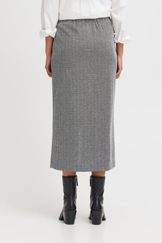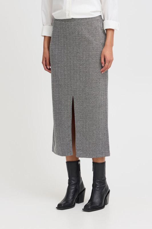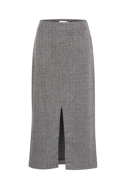 Kjol i fint herringbone mönster. Kjolen har resår i midjan, slits framtill och är i en midilängd.