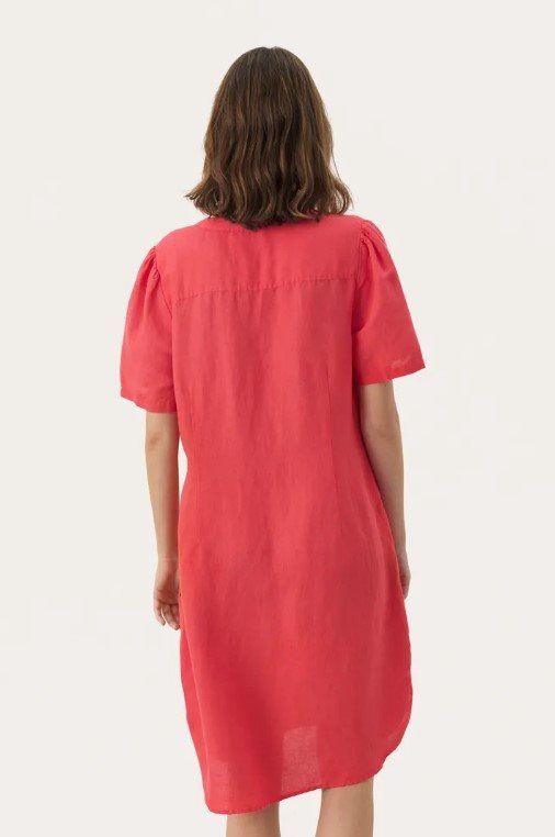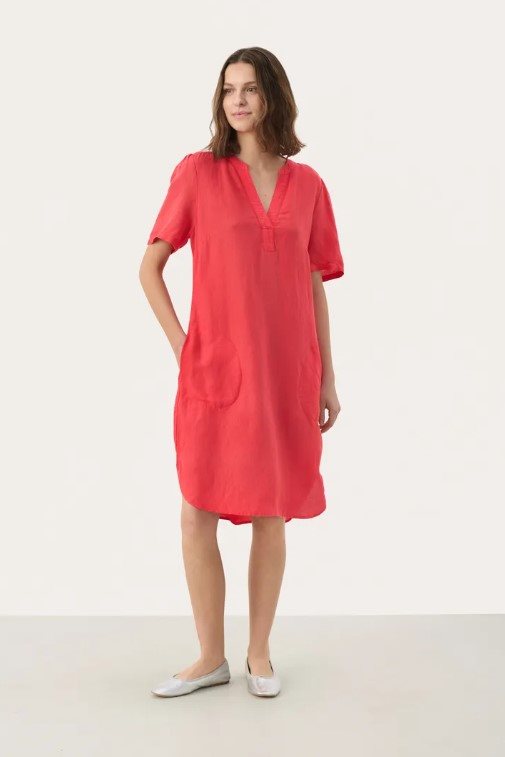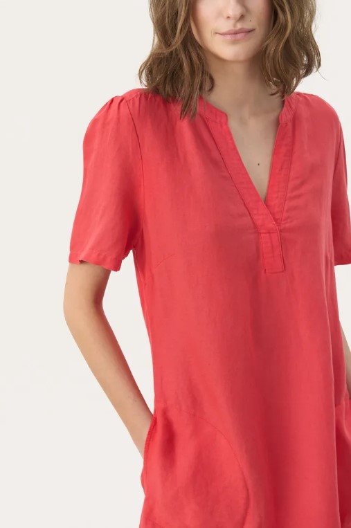 Klänning i skön linne och viskoskvalité. Klänningen är i en rak passform, har v-ringad hals, kort ärm och fickor i sidorna. Den perfekta klänningen för varma sommardagar!