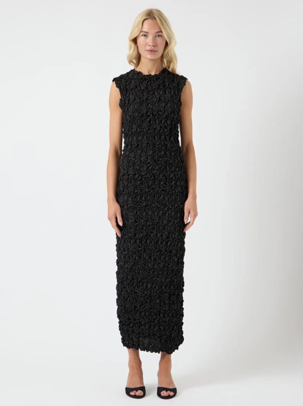 En elegant och detaljrik långklänning från Y.A.S som utstrålar modern lyx. Klänningen har en figurnära silhuett med vackert strukturerad yta i tredimensionellt tyg som ger ett exklusivt uttryck. Den är ärmlös med hög halsringning och faller i en rak, ankellång modell – perfekt för både fest och mer formella tillfällen.
