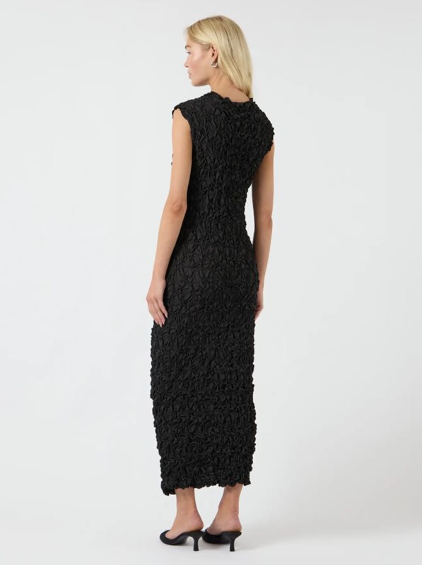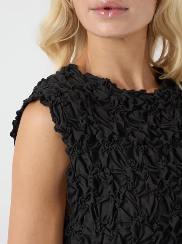 Den unika texturen skapar en levande och sofistikerad look, medan den diskreta svarta nyansen gör plagget tidlöst och lätt att kombinera med både klackar och smycken.