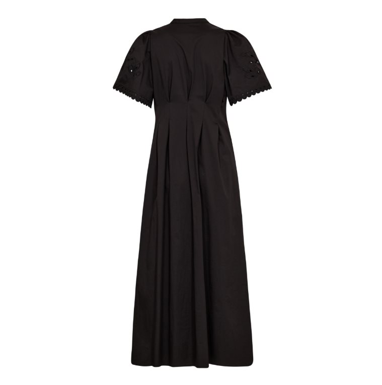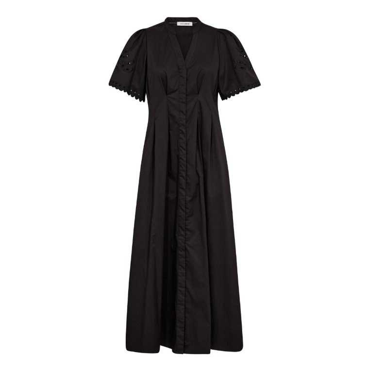 PoppyCC Emb Pleat Dress - CO'COUTURE PoppyCC Emb Pleat Dress från CO'COUTURE är en elegant och feminin maxiklänning i klassiskt svart. Den figurnära överdelen med markerad midja övergår i en vackert utsvängd kjol som skapar en smickrande silhuett. De korta ärmarna pryds av dekorativ brodyr och har en vågig kant som ger en romantisk känsla. Den stilrena V-ringningen och den genomgående knäppningen framtill ger klänningen ett sofistikerat och tidlöst uttryck – perfekt både till vardag och festligare tillfällen. Figurnära passform upptill med markerad midja Lång, utsvängd modell V-ringad hals Genomgående knäppning framtill Korta ärmar med broderade detaljer Vågig, dekorativ ärmavslutning Material: 70% bomull, 27% polyamid, 3% elastan