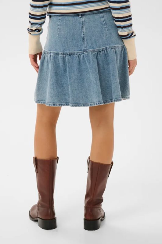 En feminin jeanskjol med modern silhuett och avslappnad känsla. Modellen har en figurnära passform upptill och en lätt utsvängd nederdel med volang som ger ett mjukt fall och fin rörelse. Perfekt att bära med stickat och boots eller med en enkel topp för en mer somrig look.
