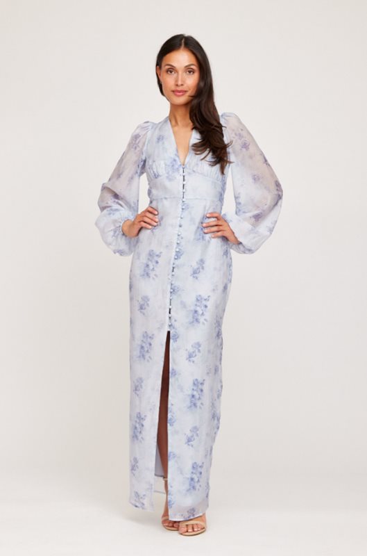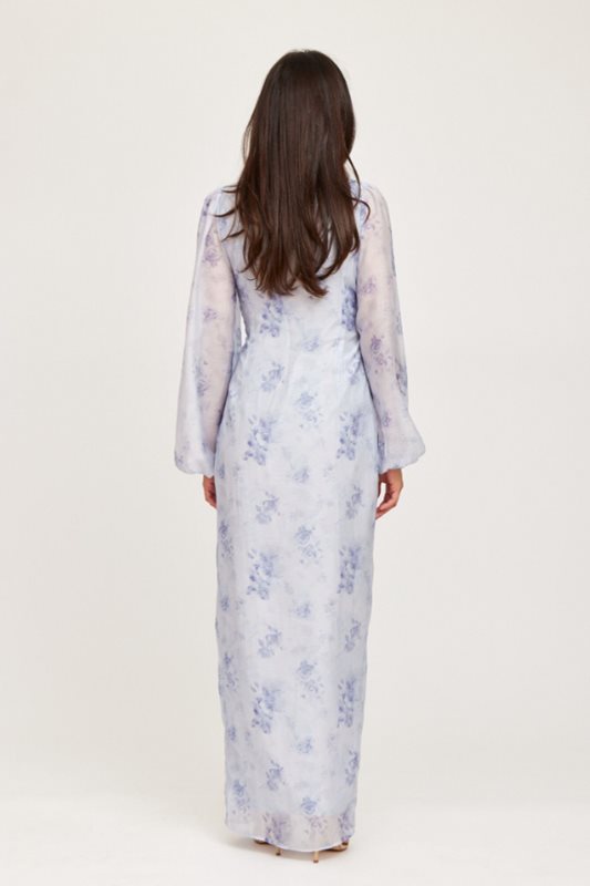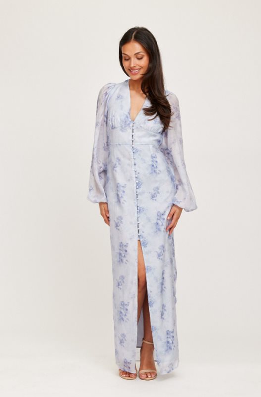Modellen har en smickrande V-ringning med klädda knappar framtill och markerad midja som skapar en feminin silhuett. De långa, voluminösa ärmarna i lätt transparent kvalitet ger en romantisk känsla, medan den diskreta slitsen framtill tillför rörelse och en subtil elegans. Den följsamma passformen gör klänningen lika fin till sommarens fester som till bröllop och andra speciella tillfällen.