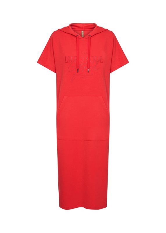 En avslappnad och stilren hoodieklänning från Soyaconcept i deras omtyckta Banu-kvalitet – en perfekt kombination av komfort och modern vardagsstil. Klänningen har en ledig passform med korta ärmar, huva och praktisk känguruficka framtill. Det subtila texttrycket på bröstet ger ett diskret men trendigt uttryck.