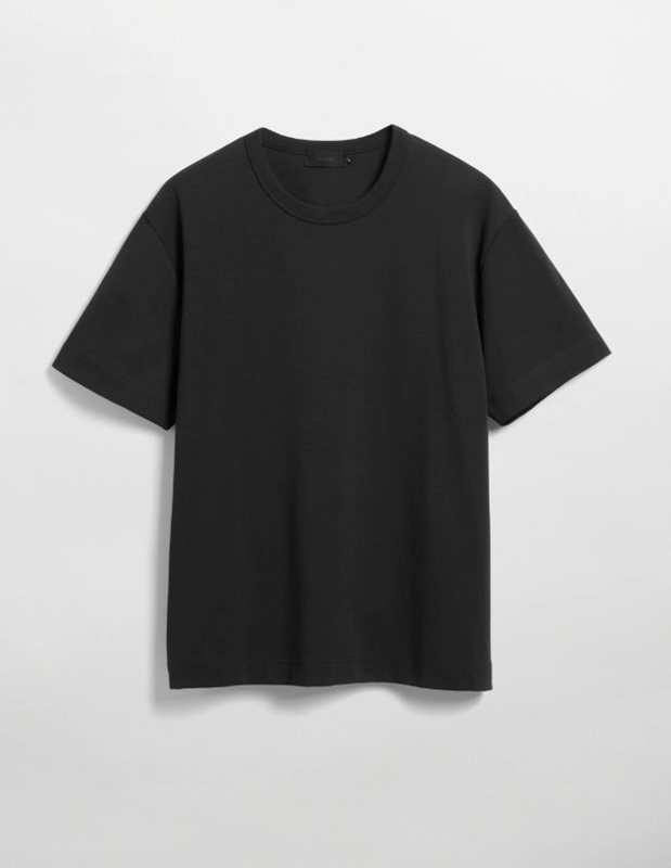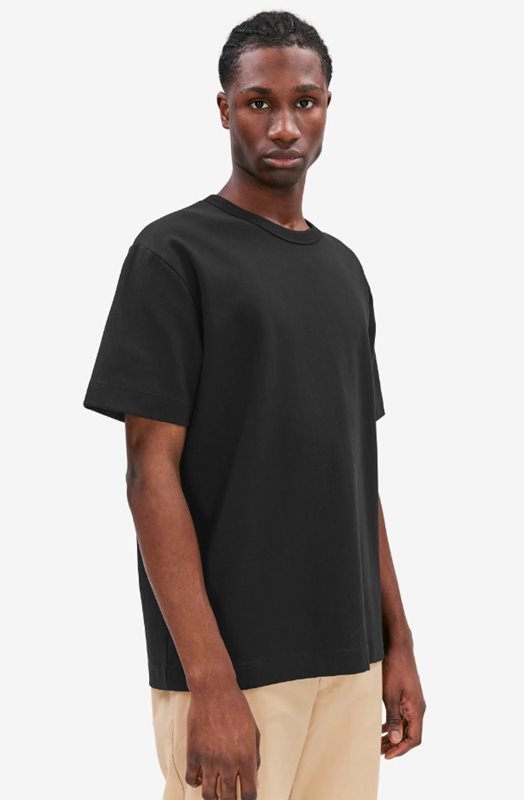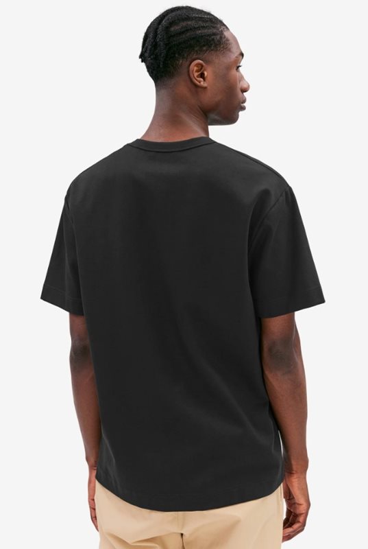 Hadar är en svart t-shirt i avslappnad passform tillverkad i Double-Faced Jersey, ett kraftigt bomullstyg som ger t-shirten en lyxigare känsla. Som det moderna basplagg det är kan Hadar bäras för sig själv som en snygg vardagslook, eller som ett lager-på-lager plagg och ge en skön bomullskänsla under jackor och overshirts.