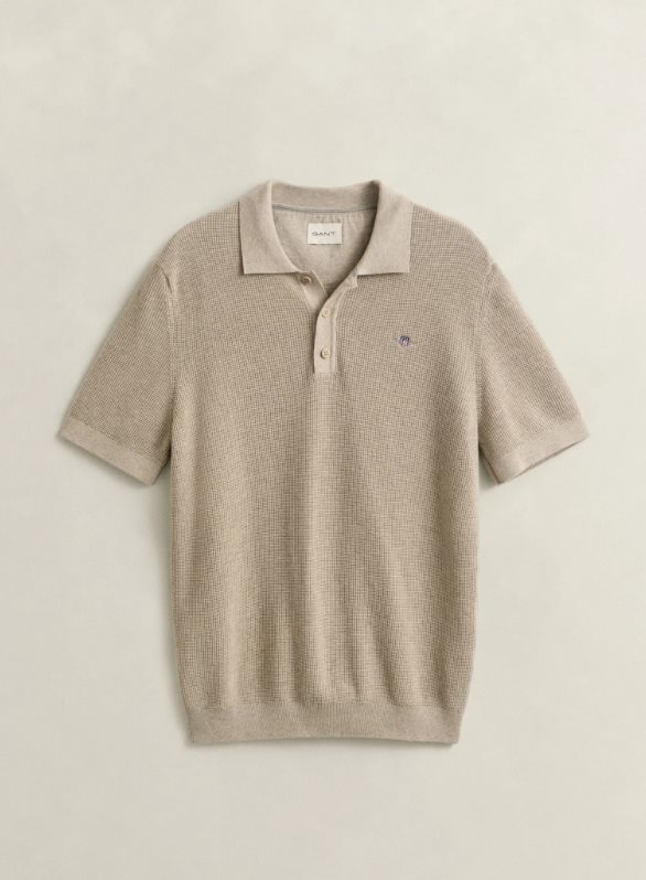 Kortärmad tröja i ekologisk bomullsblandning, stickad med en fin våffelstruktur. Den har en regular fit, pikékrage med knappslå, resår i nederkant och ärmslut, en broderad sköld på bröstet och corozoknappar på knappslån.