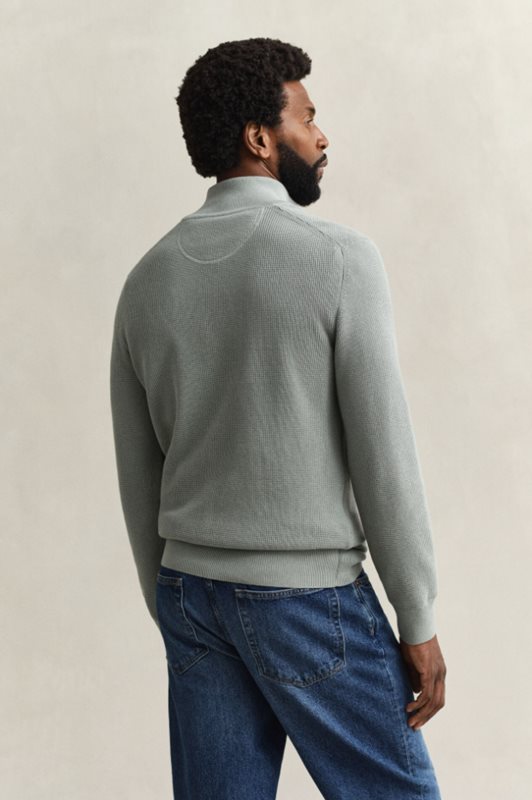 Tröjan är stickad i en ekologisk bomullsblandning med en lätt våffelstruktur. Den har en regular fit, dragkedja vid halsöppning, ribbstickade muddar och en sköld broderad på bröstet.