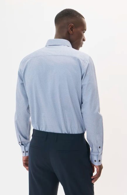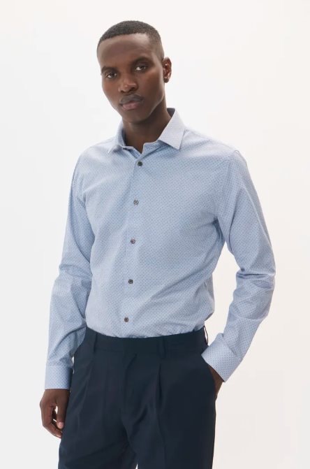 Denna långärmade skjorta har rak passform, subtilt mikromönster, klassisk spridningskrage och kontrasterande knappar. Rundad fåll och enkel manschett.
