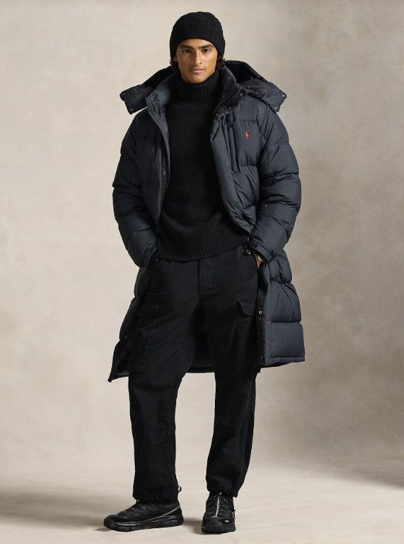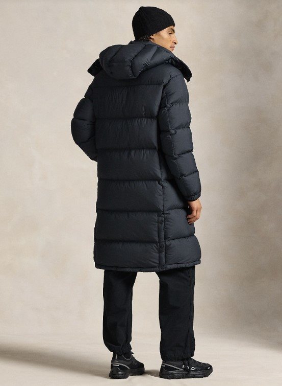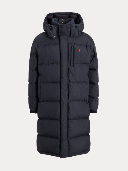 En lång, varm dunjacka från Ralph Lauren med hög krage och avtagbar huva. Jackan är designad för maximal komfort och värme under kalla dagar, med återvunnet material i både yttertyg och fyllning. Den klassiska Polo-logotypen är broderad på bröstet i rött.