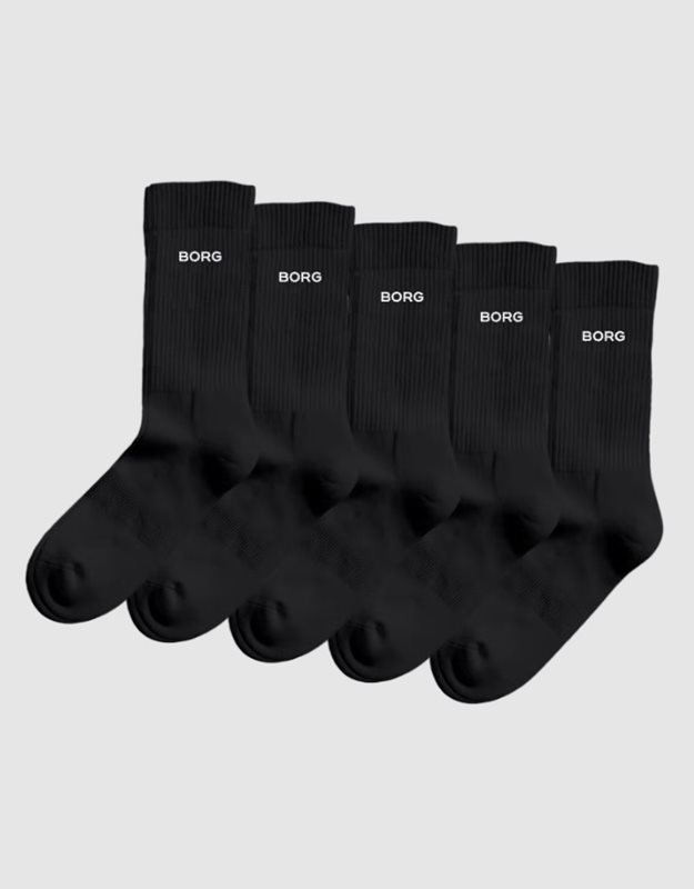 Ett mångsidigt 5-pack med Björn Borg Essential Crew-strumpor i svart. Tillverkade i en mjuk bomullsblandning med återvunnen polyester och elastan som erbjuder vardagskomfort och hållbarhet. Perfekta som dina dagliga basstrumpor med klassisk crew-höjd och bekväm passform.