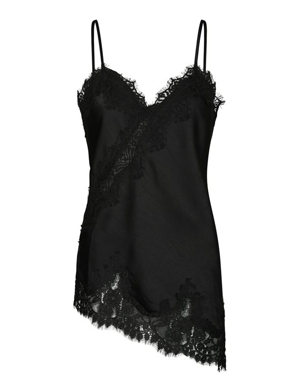 Feminint topp med spetsdetaljer i asymmetrisk form. Toppen kommer i en fin satängkvalitet. Modellen är 176 cm lång och bär storlek 36.