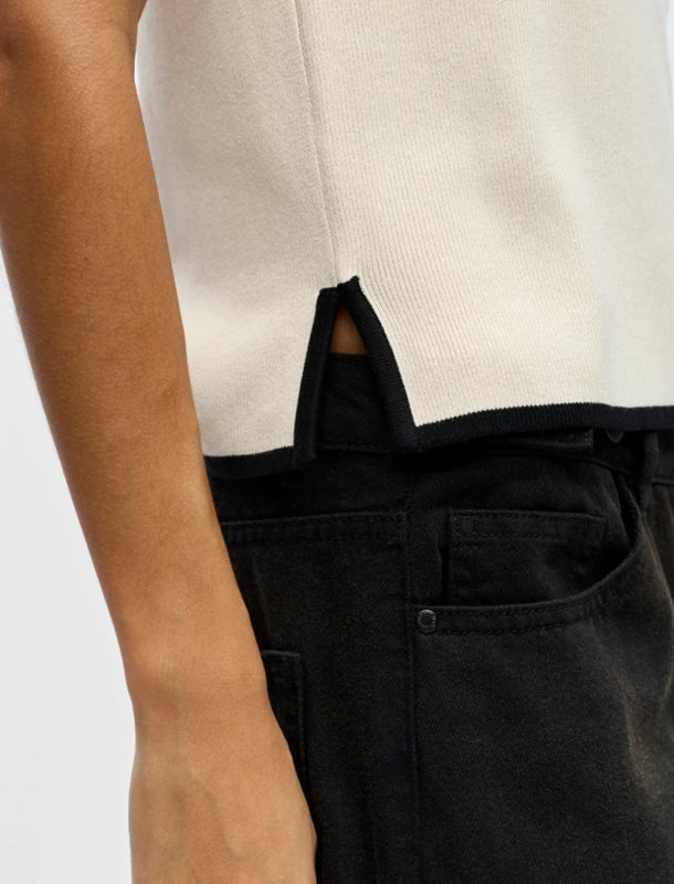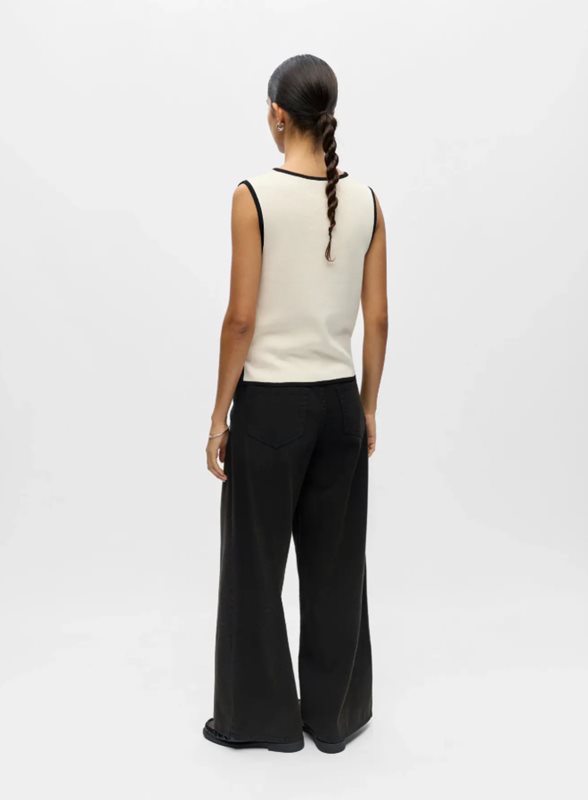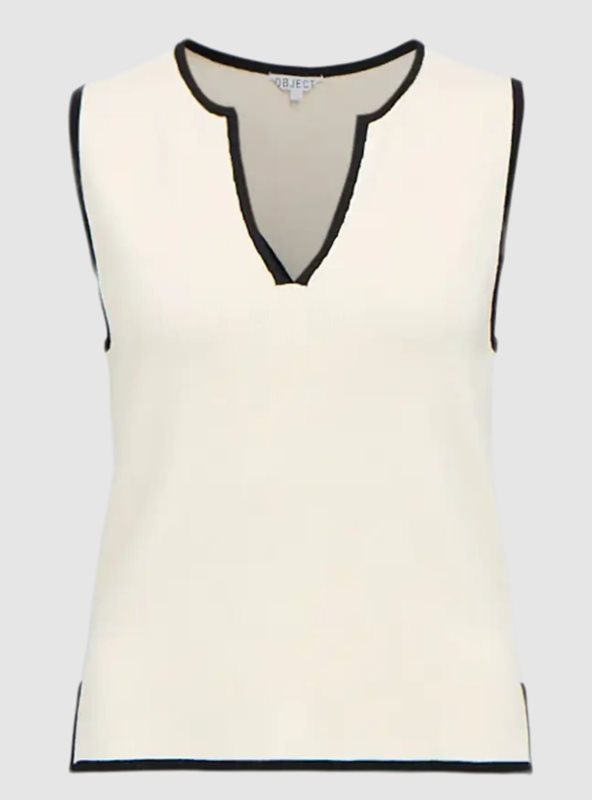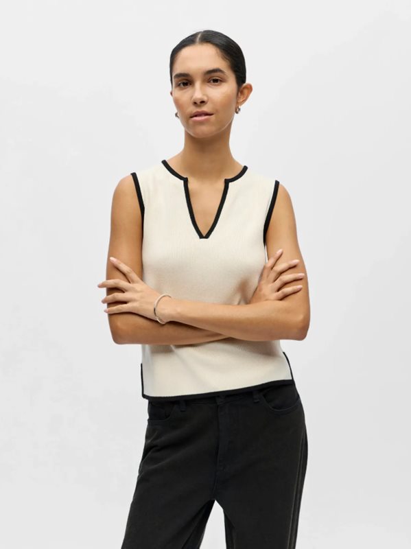 En stilren, ärmlös stickad topp i en mjuk och följsam kvalitet med elegant kontrastkant. Den smickrande V-ringningen och de rena linjerna ger ett tidlöst uttryck som fungerar lika bra till vardag som till mer uppklädda tillfällen. Perfekt att bära som den är eller under en kavaj.