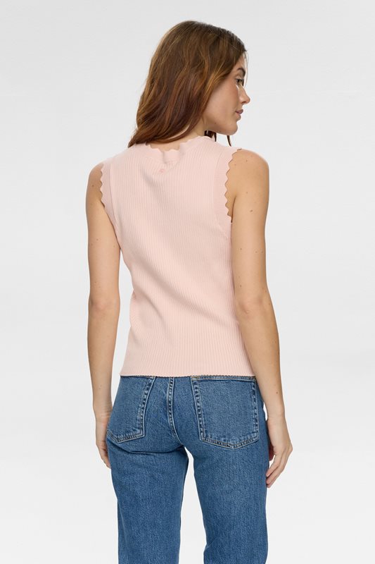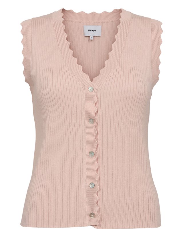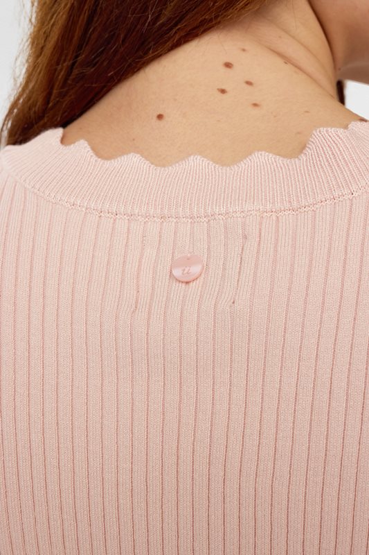 En feminin och stilren ribbstickad topp/väst i en mjuk puderrosa ton. Den v-ringade halsen ramas in av en dekorativ vågig kant som ger ett romantiskt uttryck, medan knäppningen framtill tillför en klassisk och genomarbetad känsla.