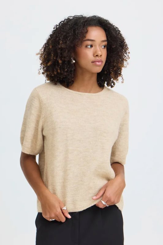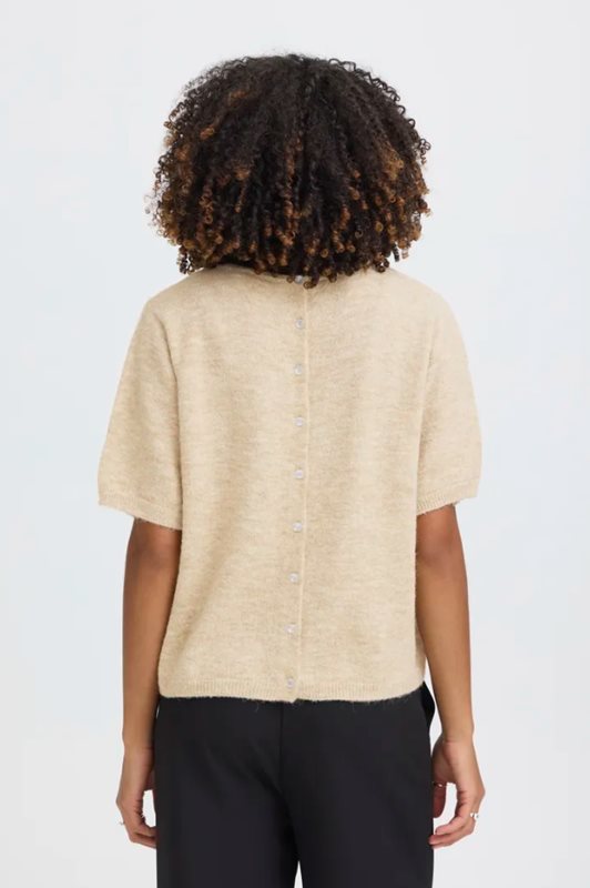 En mjuk och stilren stickad topp med en elegant detalj baktill. Den raka silhuetten och den korta ärmen ger ett avslappnat uttryck, medan knäppningen i ryggen adderar en feminin och modern touch.