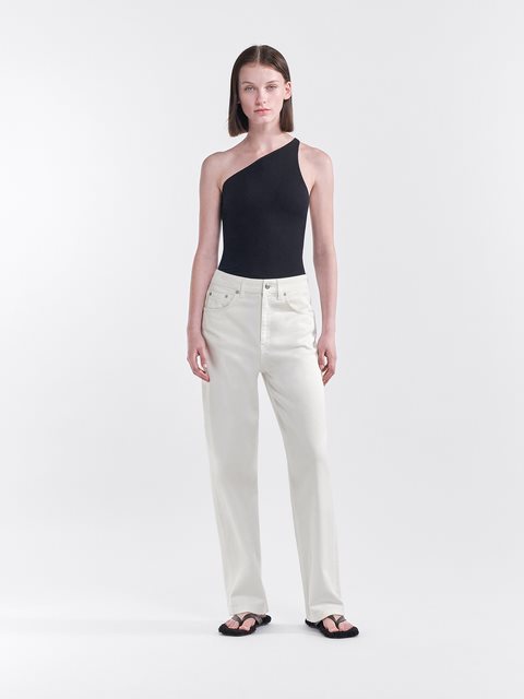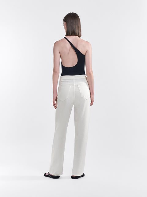 Jeans med hög midja i icke-stretch ekologisk bomull. Femficksdesign med lös passform, avsmalnande ben och avskuren längd.