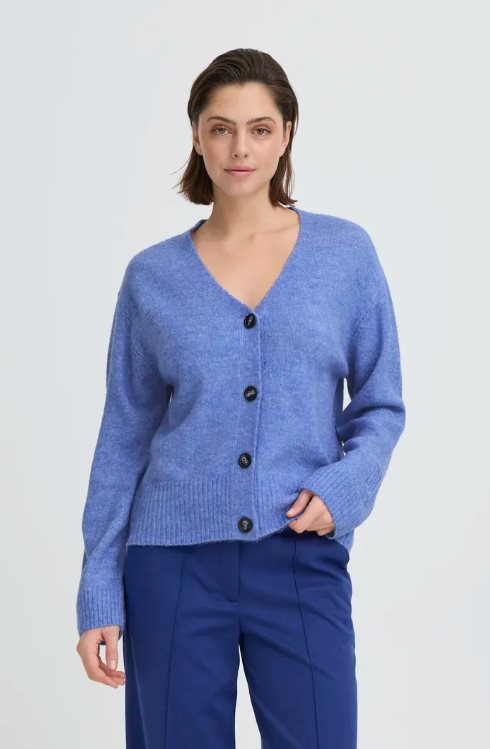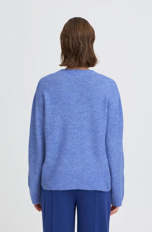 En mjuk och lättstickad kofta från ICHI i en klarblå nyans. Modellen har en feminin v-ringning och knäppning framtill med snygga, mörka knappar som ger fin kontrast. Den avslappnade passformen med ribbade kanter gör koftan enkel att bära både till vardags och på jobbet – lika fin till jeans som till kostymbyxor. Diskret broderad logodetalj vid ärmslut.