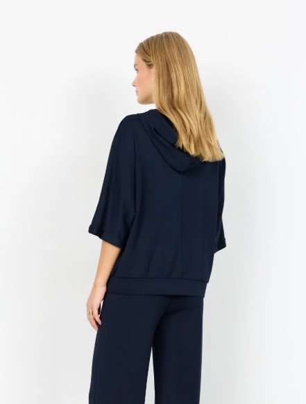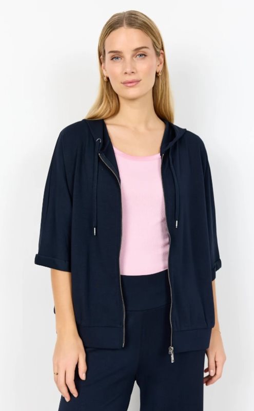 En mjuk och avslappnad huvtröja med korta ärmar från SoyaConcept. Den raka passformen och den dubbla dragkedjan gör den enkel att styla både öppen och stängd. Perfekt för lediga dagar eller som ett bekvämt lager i vardagen.