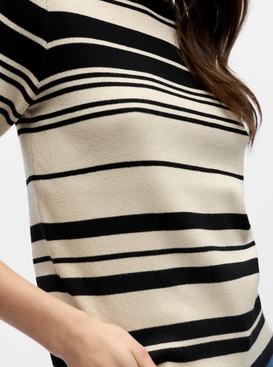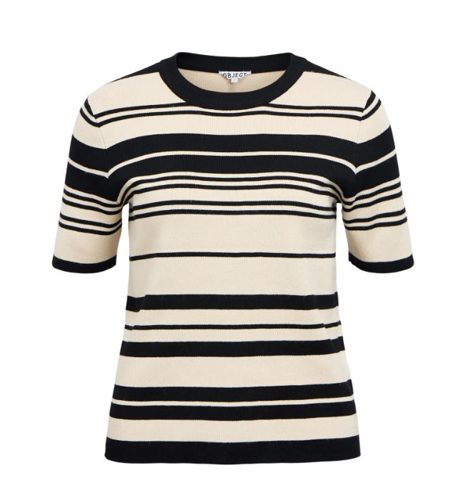 OBJESTER S/S New Knit Pullover från Object är en stilren, kortärmad stickad tröja med ett klassiskt randigt mönster. Modellen har rund halsringning och en smickrande, lätt figurnära passform som ger ett tidlöst och välklätt uttryck. Den mjuka och följsamma kvaliteten gör tröjan bekväm att bära hela dagen.