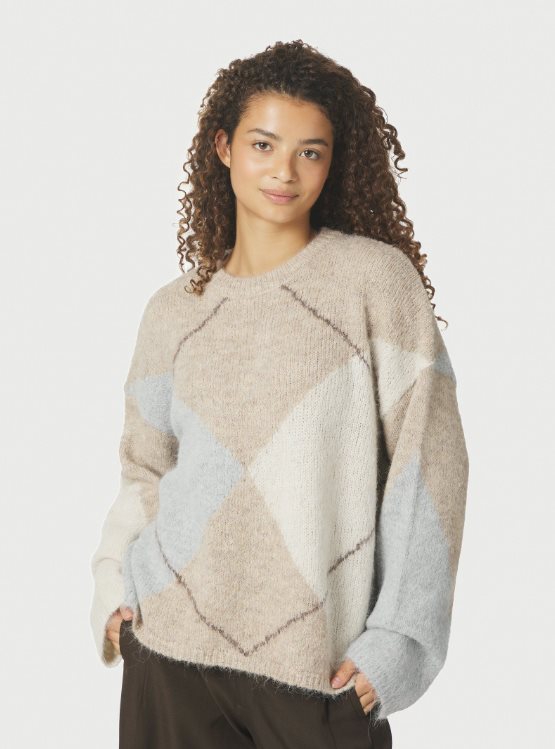 Inga Check Fluff Knit Blouse från Neo Noir är en mjuk och fluffig stickad tröja med ett stilrent argyle-inspirerat rutmönster i ljusblå, beige och creme. Den har en avslappnad passform med rund hals och långa ärmar, vilket gör den lika snygg till vardagsjeans som till en satinkjol för en mer uppklädd look. En riktig mysfavorit som lyfter outfiten med sitt mönster och sin gosiga känsla.