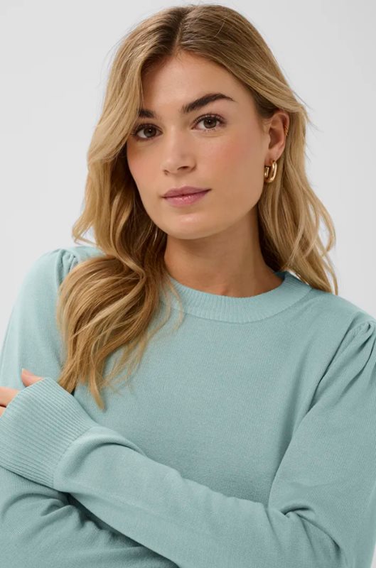 Stickad tröja i regular fit med långa ärmar, rund halsringning och lätt puffade axlar. tröjan har ribbstickade avslut vid hals, ärmslut och nederkant.
