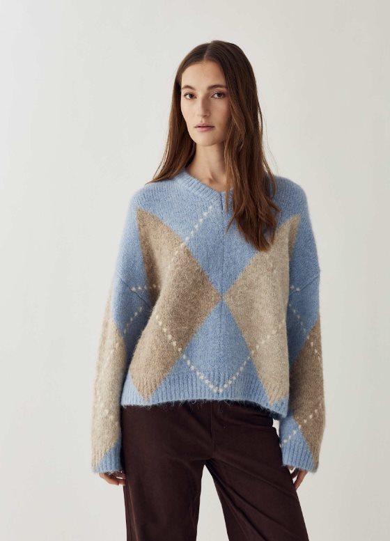 Lai Knit från Noella är en tidlös stickad tröja med klassisk argyleruta – här i en mjuk kombination av himmelsblått och beige. Den harmoniska färgsättningen ger ett fräscht men samtidigt sofistikerat uttryck som passar lika fint året om.